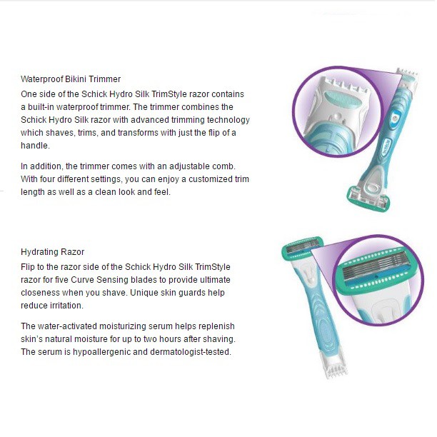 Combining the uniquely designed schick hydro silk razor with advanced trimming technology, this razor shaves, trims, and transforms with just the flip of a handle schick hydro silk trimstyle razor. This moisturising serum is clinically proven to provide lasting hydration for up to 2 hours after shaving.